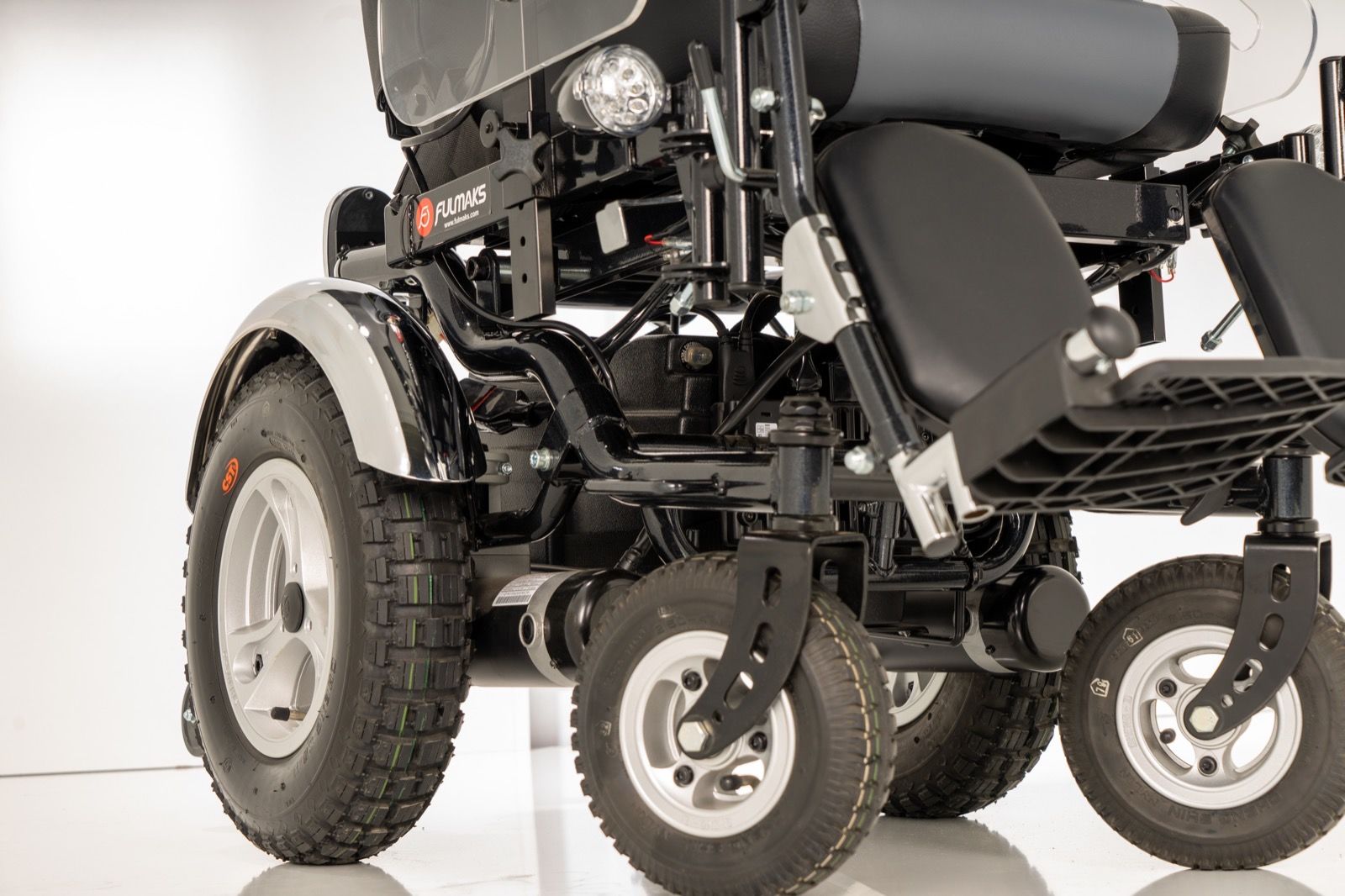 Fulmaks 7896 arazi akülü tekerlekli sandalye, güçlü motion tech motoru, amortisörleri ve havalı tırtıklı tekerleri sayesinde düz olmayan, bozuk yollarda rahatlıkla hareket edebilir.